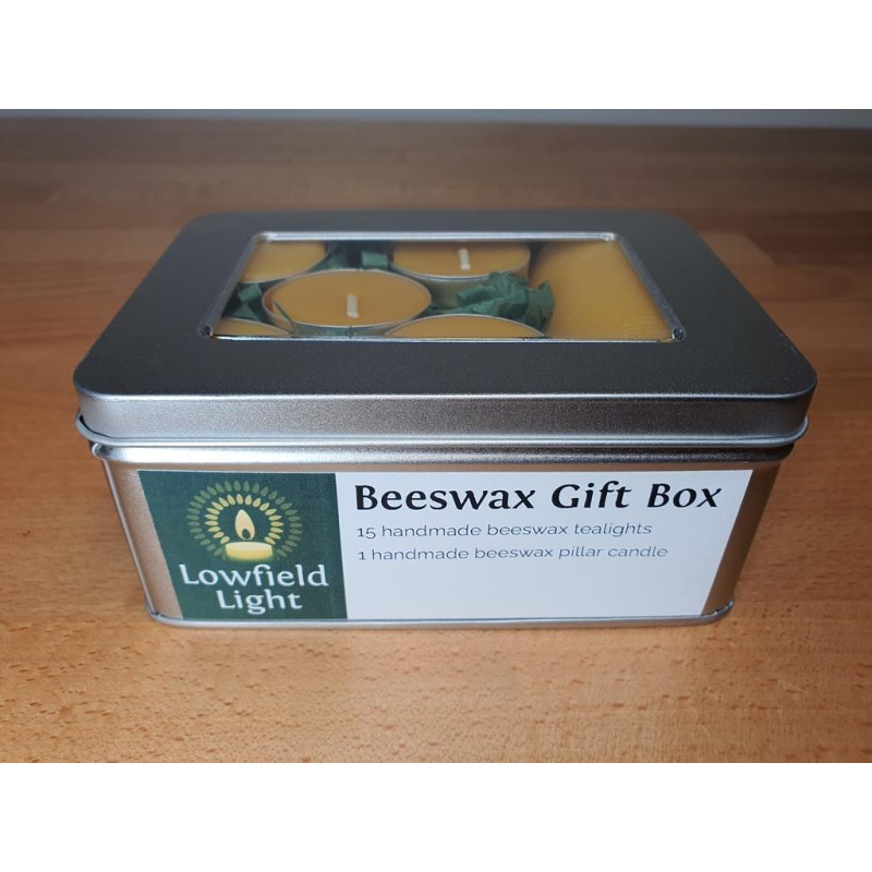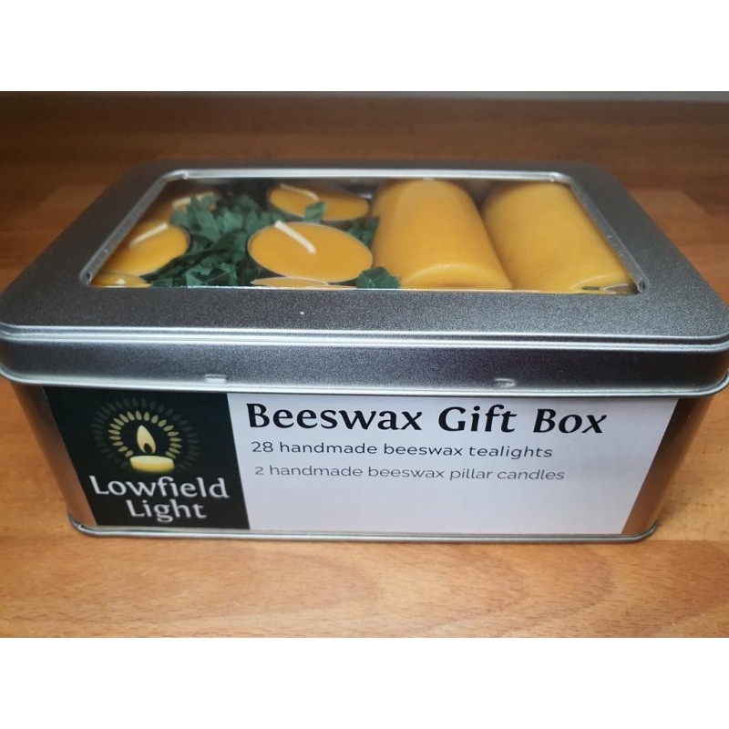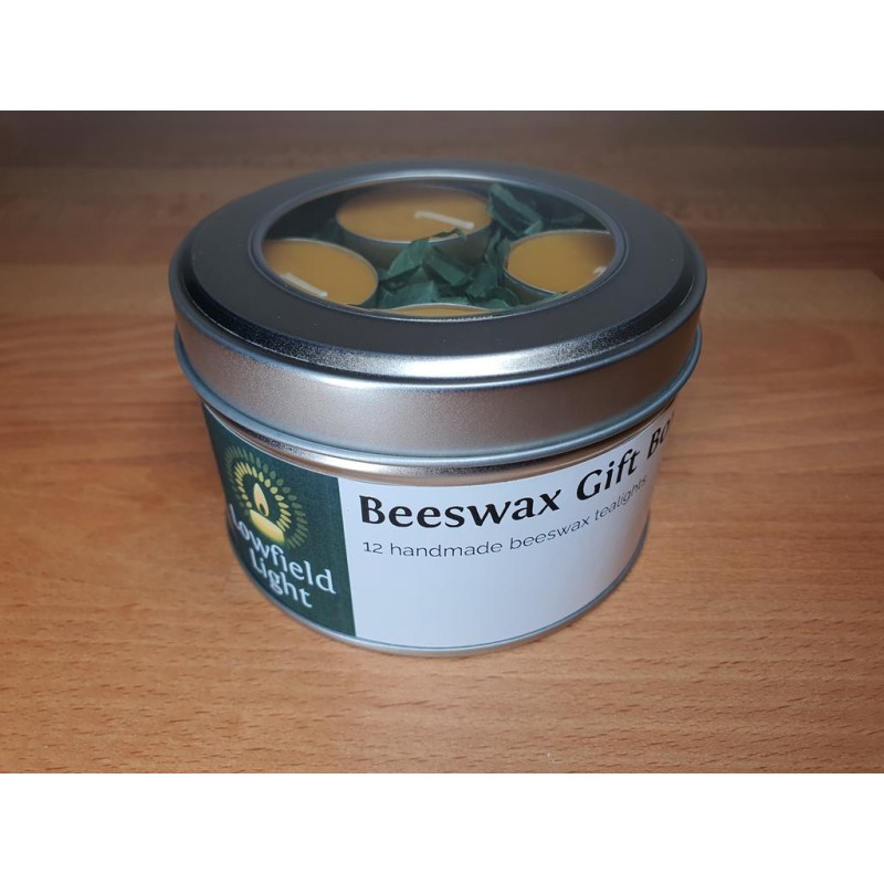 A reusable tinplate box filled with hand poured tealights and candles made from 100% real beeswax and pure cotton wicks. They burn with a clear, bright flame with almost no soot and a very faint scent of honey.